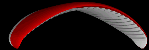 Mais ce n'est pas tout de voler droit, puisque le plaisir de la Cage, c'est aussi et surtout la glisse des grandes et petites courbes. A la première mise en virage aux petites inclinaisons, on est surpris par deux choses. La première, c'est une certaine tendance à cabrer naturellement, qui fait que le virage se cadence presque tout seul ... le virage qui "plonge" dès la mise en roulis si on ne cadence pas, que l'on connait sur Lagon, n'est plus à l'odre du jour (je précise : "aux petites inclinaisons"). Ce n'est pas pour autant que le pilotage automatique doit être branché, puisque il faut quand même penser à cadencer dès que le virage s'affirme un peu. Ce qui m'amène à la seconde constatation : il existe une petite impression de lourdeur sur les deux ou trois premiers virages que l'on initie. Puis on se rend compte d'une part que cela vient des bouts d'aile nettement plus puissants que sur Lagon, et d'autre part d'un moment pendulaire différent lui aussi. Résultat : il faut découvrir le "rythme" de cette voile, comme on découvre celui d'une Lagon, et y caler son pilotage. Ceci fait (cela va vous prendre de quelques minutes à quelques dizaines de minutes), on retrouve une voile légère à la mise en roulis, qui est un véritable régal en vol dynamique. Dans le zig du zag, les virages passent sans effort, on accompagne le mouvement par un beau cadencement, et wouuufffff, ça glisse comme sur un parquet ciré ;-))