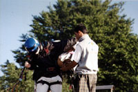 Préparation d'un passager biplace par Thierry et Yves (de dos)