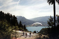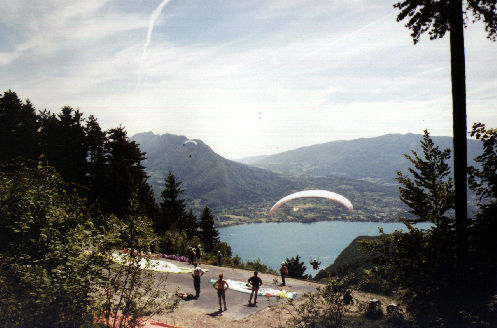 Décollage de Planfait (Annecy). Au loin, le Lac d'Annecy et le Semnoz sur la droite. |